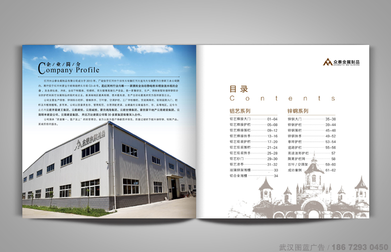 涉及項目:鋅鋼陽臺護欄畫冊設計、鋅鋼大門畫冊設計、鋁藝大門畫冊設計、后期畫冊印刷制作